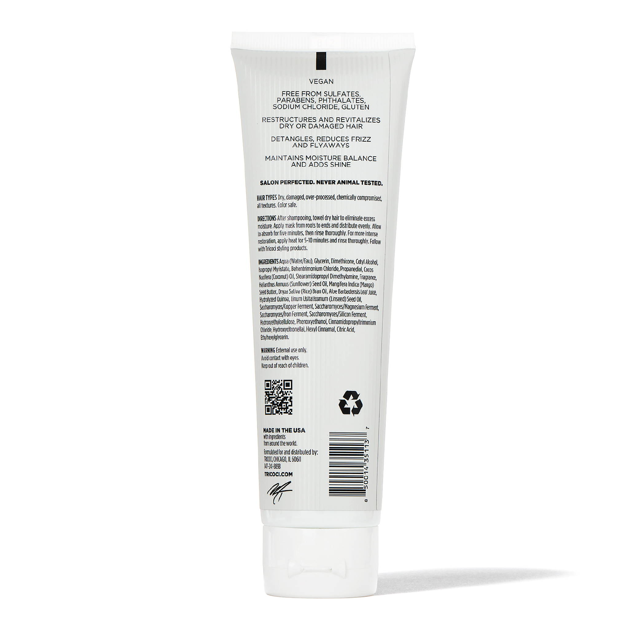 How to use: After shampooing, towel dry hair to eliminate excess moisture. Apply mask from roots to ends and distribute evenly. Allow to absorb for five minutes, then rinse thoroughly. Follow with your favorite Tricoci styling products.